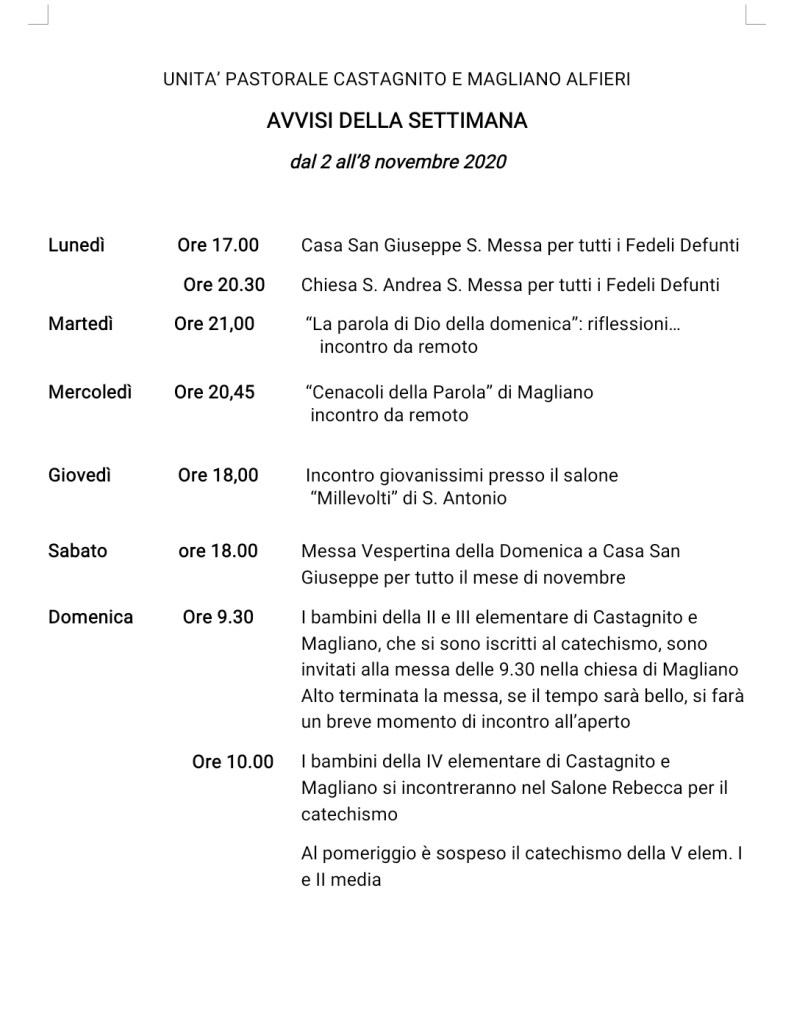 Senza categoriaAvvisi della settimana da lunedì 2 Novembre 31 ottobre 2020 iltralcio PARROCCHIE DI CASTAGNITO E MAGLIANO ALFIERI Condividi: Fai clic per condividere su Facebook (Si apre in una nuova finestra) Facebook Fai clic per condividere su WhatsApp (Si apre in una nuova finestra) WhatsApp Mi piace Caricamento...
